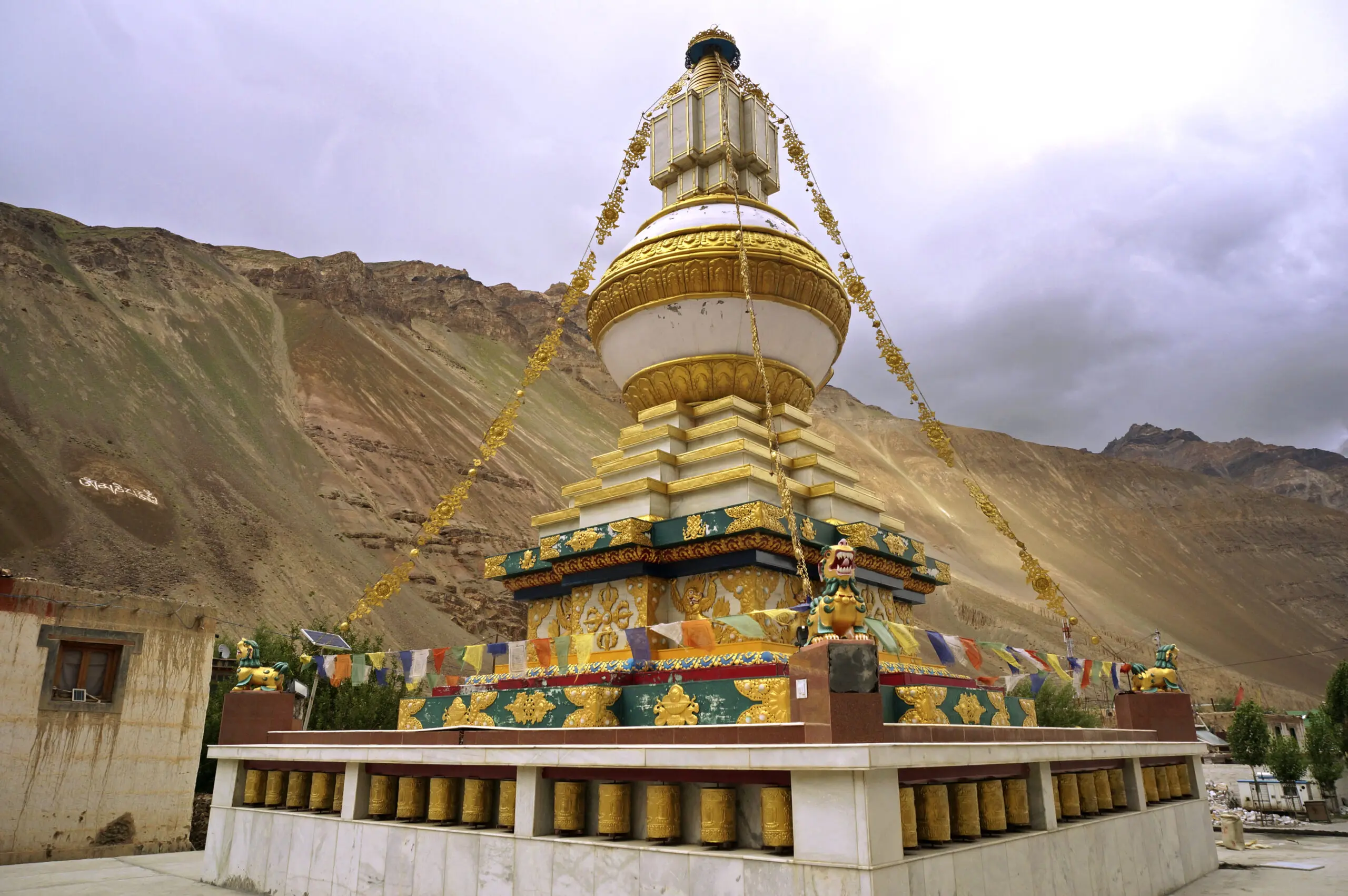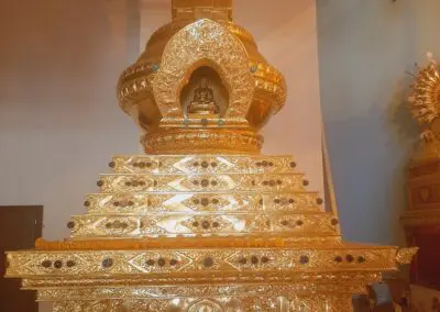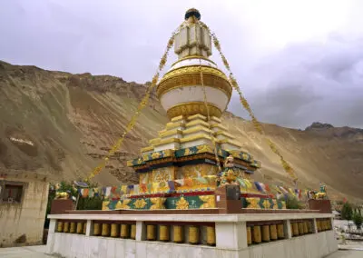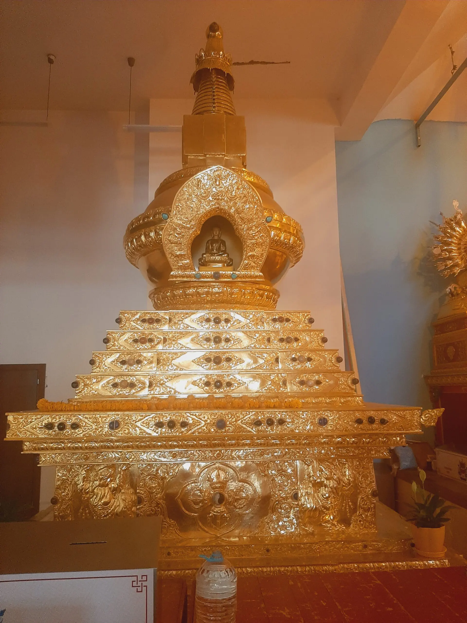 This Kalachakra Stupa in Garanas is filled with precious substances, mantras, sacred texts, blessed items, and relics from great masters and lineages. Although these sacred contents are not visible from the outside, they are traditionally understood to make the stupa a living vessel of blessings, benefiting all beings who come into contact with it.