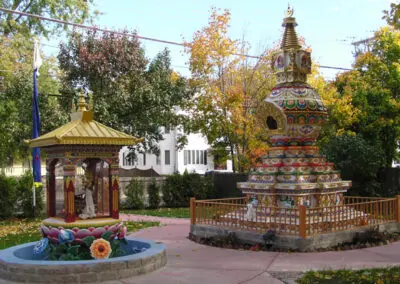 There are several different styles and interpretations of the Kalachakra stupa that all map to the instructions in the tantra. Various masters overtime have interpreted the instructions differently while maintaining the essence. The form that is at Dzokden Kalapa is found in the Gelug tradition and is based on HH Dalai Lama’s World Peace Stupa in Dharamshala.
